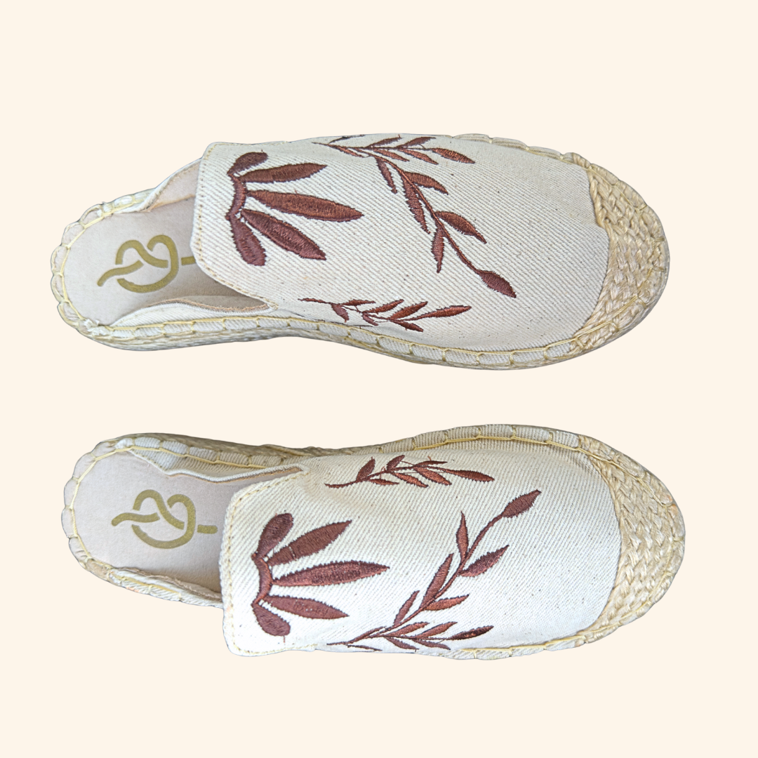 Zueco Bordado Flores Café Mujer fabricadas en yute, conocidas como "fibra dorada" por ser de origen vegetal y 100% biodegradable, su material las hacen resistentes, cómodas e ideales para cualquier ocasión. Son un producto colombiano fabricado por artesanos de la región.